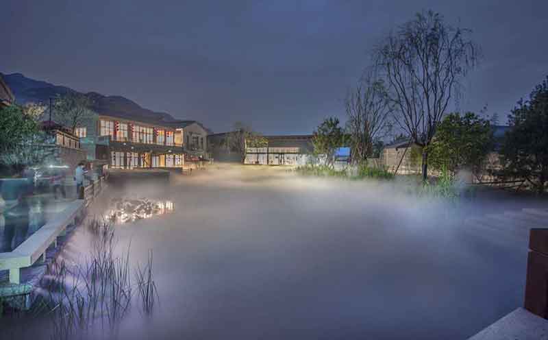 冷雾系统是一种造雾装置,也是目前为止雾化颗粒很细的高压人工造雾设备。它以自然水为原料,通过水处理、高压以及特有的雾化喷嘴,将水雾化成1-10微米的水分子,使之成为和自然的云、雾基本相同的组织结构,从而也能够很自然的漂浮于空气当中,形成云雾效果。由于在其造雾过程中,会产生大量的负离子,人们置身于其中,能感受到犹如森林中原始、清新的气息,因此我们将其命名为“冷雾森林”景观喷泉。